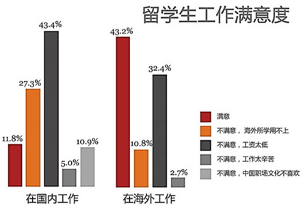 留学生回国求职中,找到现在工作的平均时间为3.6个月。个案访问显示,绝大多数留学生在1个月内获得面试机会。但是在国内找工作的留学生中,表示"找不到喜欢"的占到62.7%,嫌弃薪水低不愿屈就的占12.5%。无论在职还是在求职的留学生都表示,国内职业机会的竞争激烈超出他们在国外的预计,仅从学历和专业角度,他们在求职中并不突出。